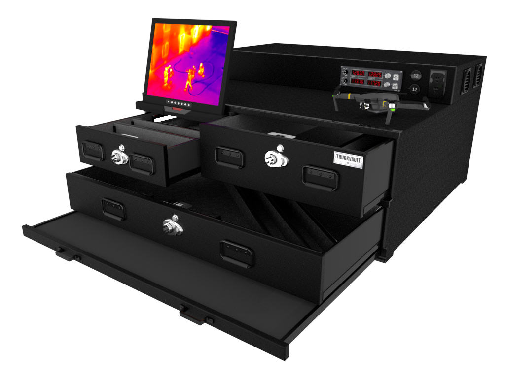 The perfect design for anyone looking for high-security storage system for their SUV that maximizes storage space in two separate drawers, mounted to the floor. Specifically sized to allow for scoped weapons upright in the drawer. Equipped with our Strike-Guard and Simplex Combination lock for industry-leading security.