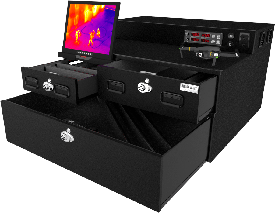 The perfect design for anyone looking for high-security storage system for their SUV that maximizes storage space in two separate drawers, mounted to the floor. Specifically sized to allow for scoped weapons upright in the drawer. Equipped with our Strike-Guard and Simplex Combination lock for industry-leading security.