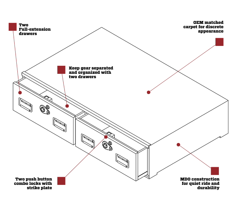 Hidden discreetly inside your SUV, the 2-drawer system provides secure, concealed storage protected by your vehicle's security system and Truckvault's legendary ultra-secure locking drawers.