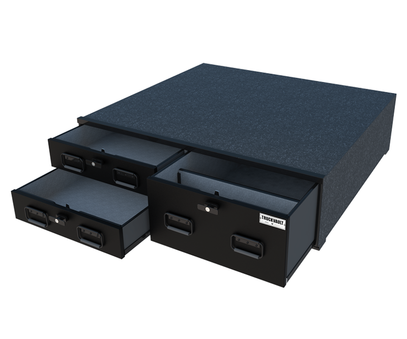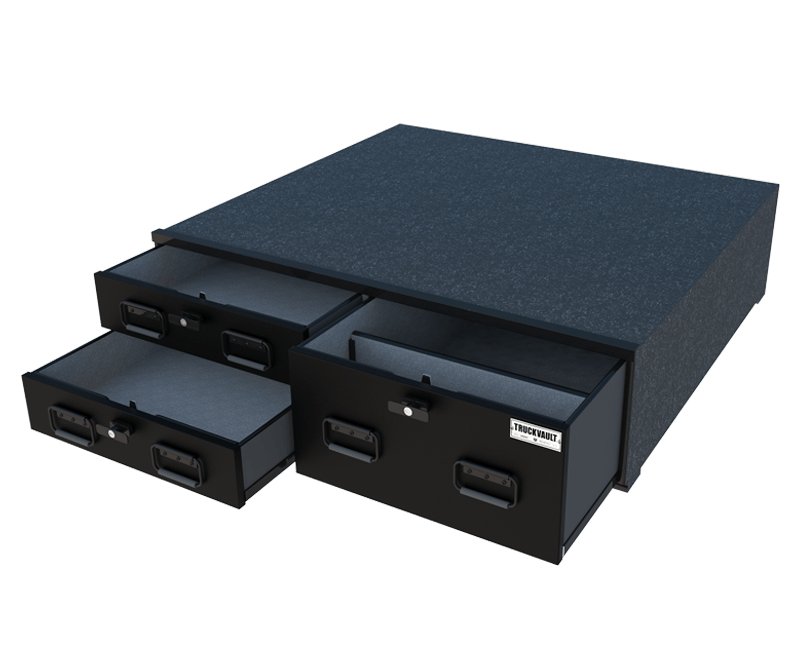 All TruckVault secure in-vehicle storage solutions in our Commander Line are built with a purpose in mind. Streamlined for those who travel light, the Field Ranger is a low-profile three drawer Command Center that provides its user simple functionality. Two shallow drawers on the driver's side allow for efficient storage of smaller items and a deep magnum drawer facilitates larger equipment storage.