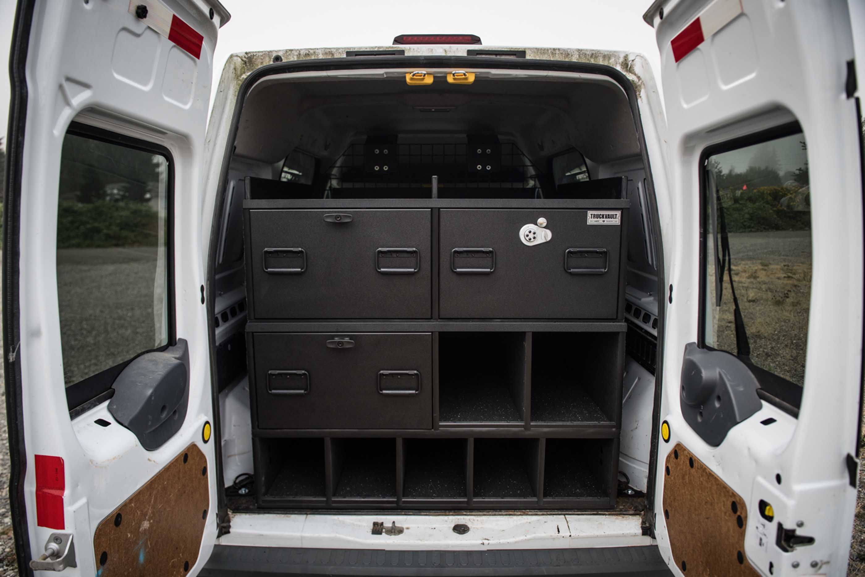 Straight On Custom cubbies Black Comp Drawer Face Kaba Lock black t-handle lock Rubber mat Spring Handles 2017 Ford Transit Connect SUV Series Commander Line Surveyor tool Storage Equipment Storage Secure Storage Transit Connect