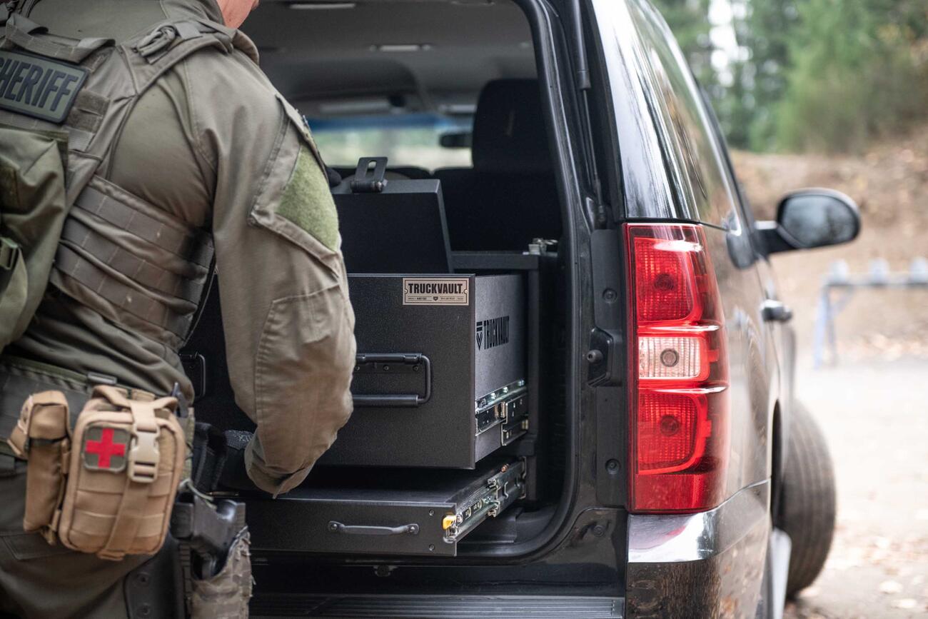 Image Year 2016 Products Sport Utility Series SUV Base Line Magnum 2 Drawer Vehicle Chevy Tahoe Activity Law Enforcement SWAT Tags 2016 Chevy Tahoe Black Comp Drawer Face Spring Handles Drawer Slides Gear Storage Tactical Gear Secure Storage Tahoe