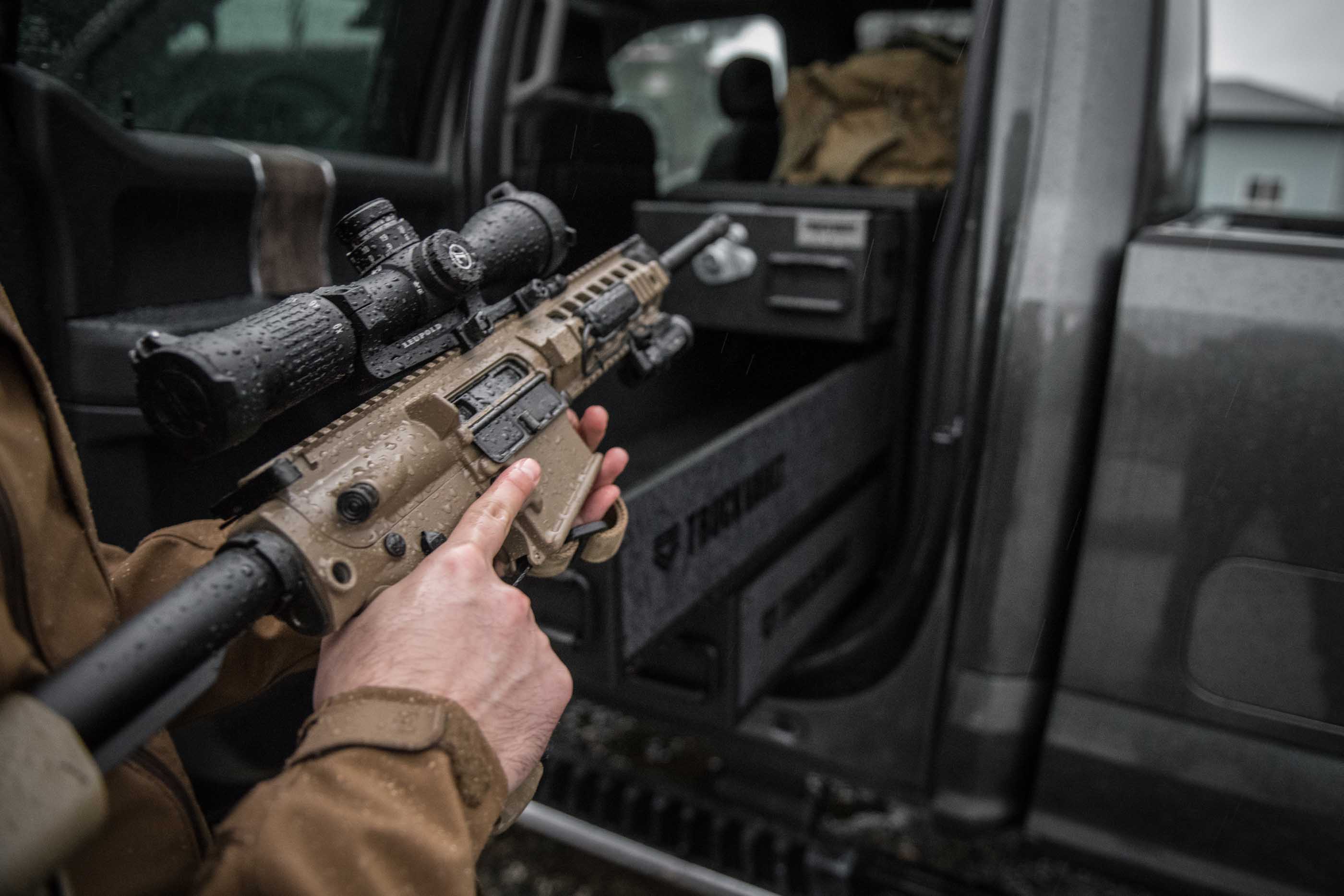 Image Year 2017 Products Pickup Series Interior Cab Line SeatVault Vehicle Ford Super Duty Activity Law Enforcement Tactical SWAT Tags Close up Custom Black Comp Drawer Face Kaba Lock Spring Handles gun storage Equipment Storage Secure Storage 2017 Ford Super Duty Interior Cab Line SeatVault Custom Super Duty