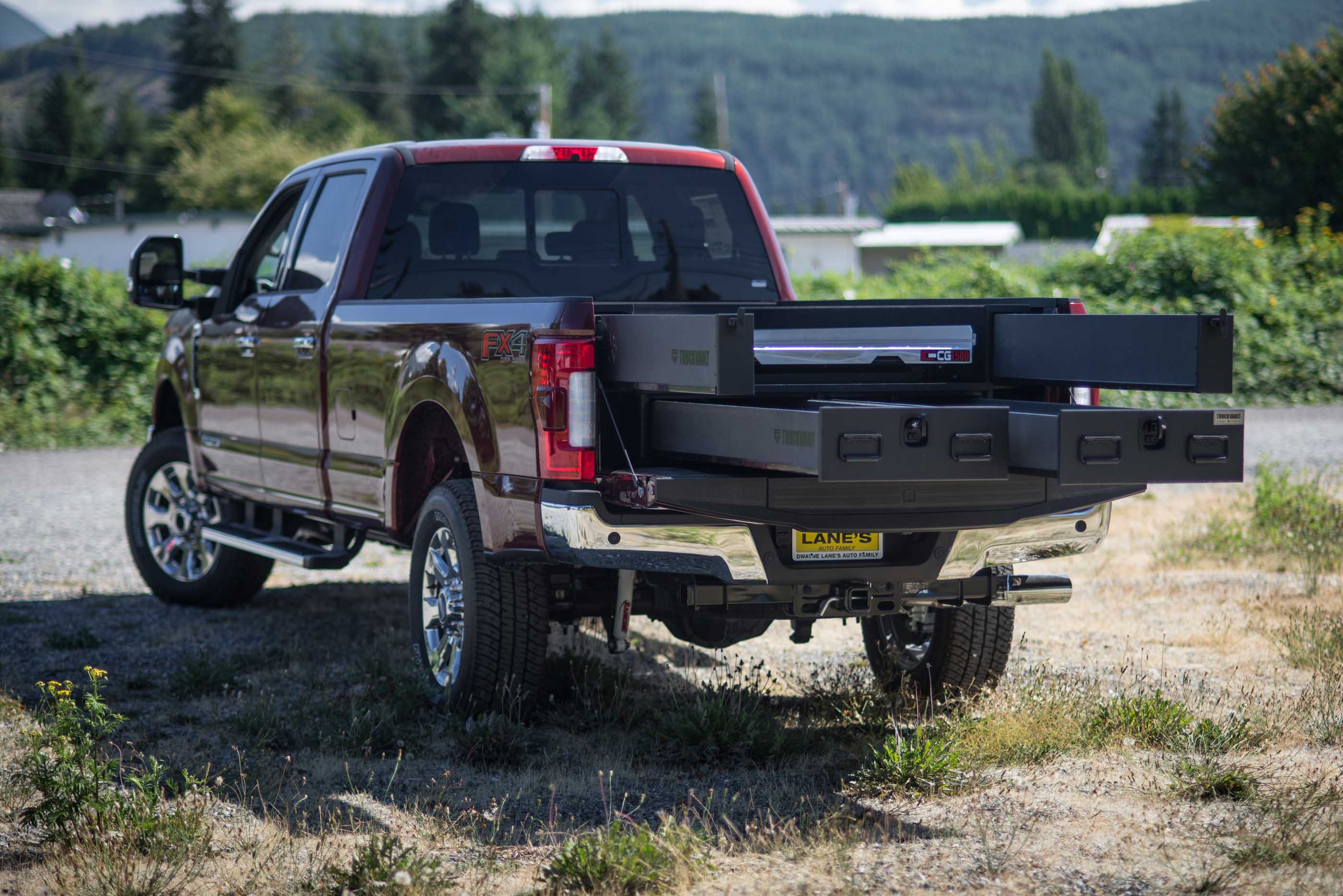 A Ford F250 with a custom 2 drawer TruckVault and a CargoGlide.