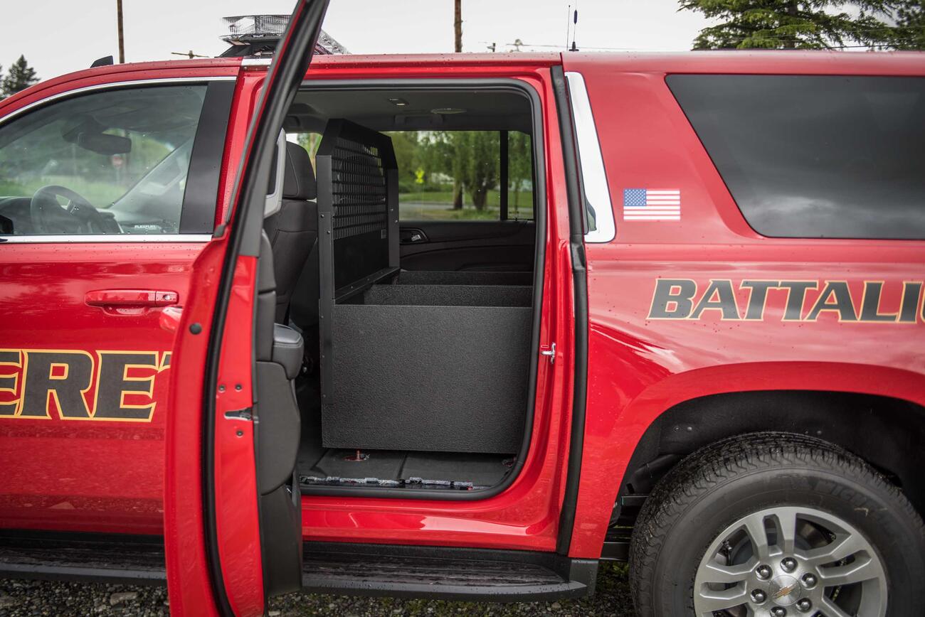 Image Year 2017 Products Stacked Designs Vehicle chevy suburban Activity public safety Search and Rescue Organization Gear Storage Tags Side Door Access storage bins Cargo Barrier Custom
