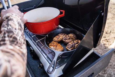 As a hunter of all sorts and a chef of the highest order, Gerard understands the intersection of hunting and cooking perhaps better than anyone, and he’s a big fan of the TruckVault camp kitchen. “Any outdoorsman who loves cooking outdoors,” he said. “It’s the perfect little thing and a must-have. It had a big built-in, bamboo cutting board for me to prepare the meal on, drawers for utensil storage, and a camp stove that all pulled out for easy in-the-field food preparation. I'm now hooked and can’t wait to get one for my personal truck."